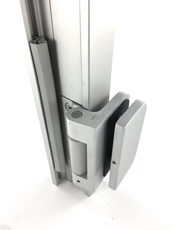 System trzech rodzajów profili ościeżnicowych do drzwi szklanych ze zintegrowanymi zawiasami do mocowania tafli drzwi.